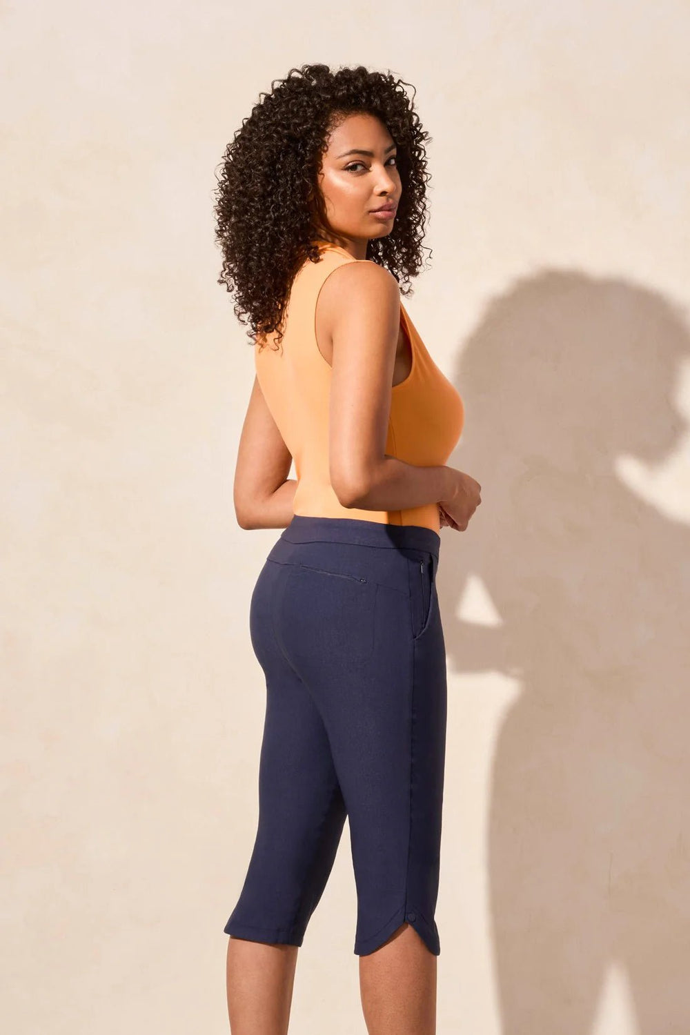 Refresh your wardrobe with these capri pants, featuring a flattering slim leg design and a rounded back yoke, all enhanced by Flatten It® Technology for a beautifully contoured silhouette. Crafted from a soft stretch twill weave, they deliver the comfort you crave, while the discreet zipper pockets combine style and convenience. The dyed-to-match rivets elegantly highlight the rounded hem, providing a polished and sophisticated finish.