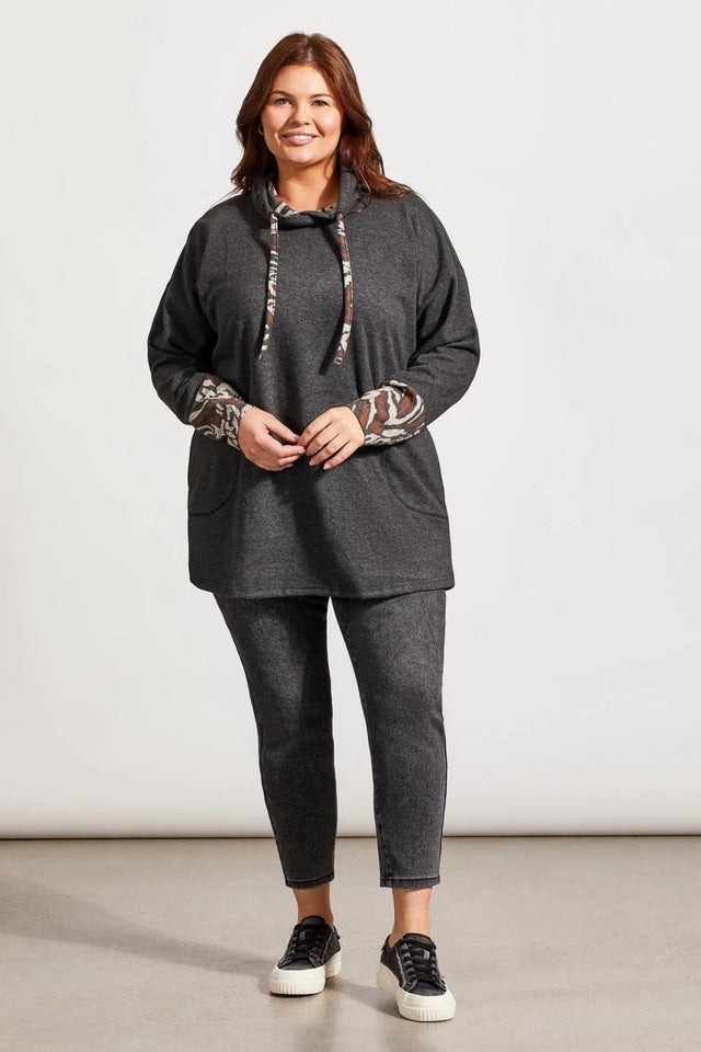 Bring fierce style to everyday ensembles with this cowl neck tunic featuring contrasting leopard print panels. The pop-over design is pulled together with long drop-shoulder sleeves, adjustable drawcords, a close fit, functional side pockets, and fuzzy knit fabric that you'll want to wear on repeat.