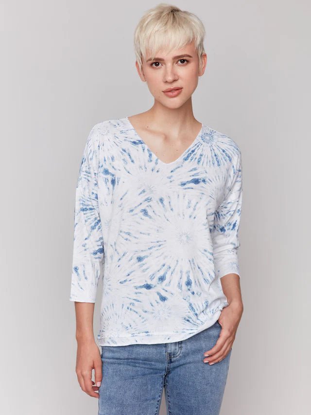 Charlie B Women's Printed V-Neck Top - Denim / S is backordered and will ship as soon as it is back in stock.